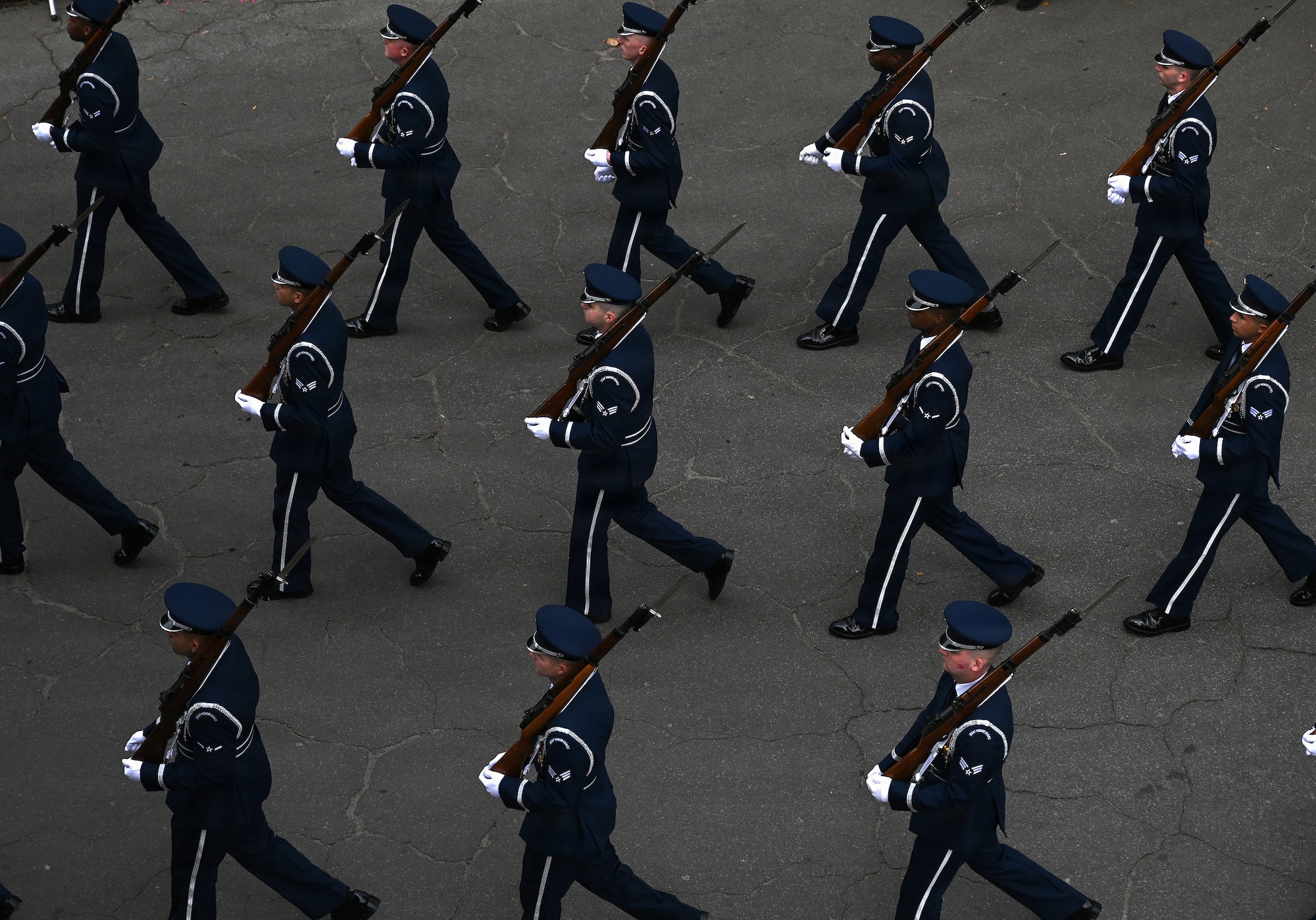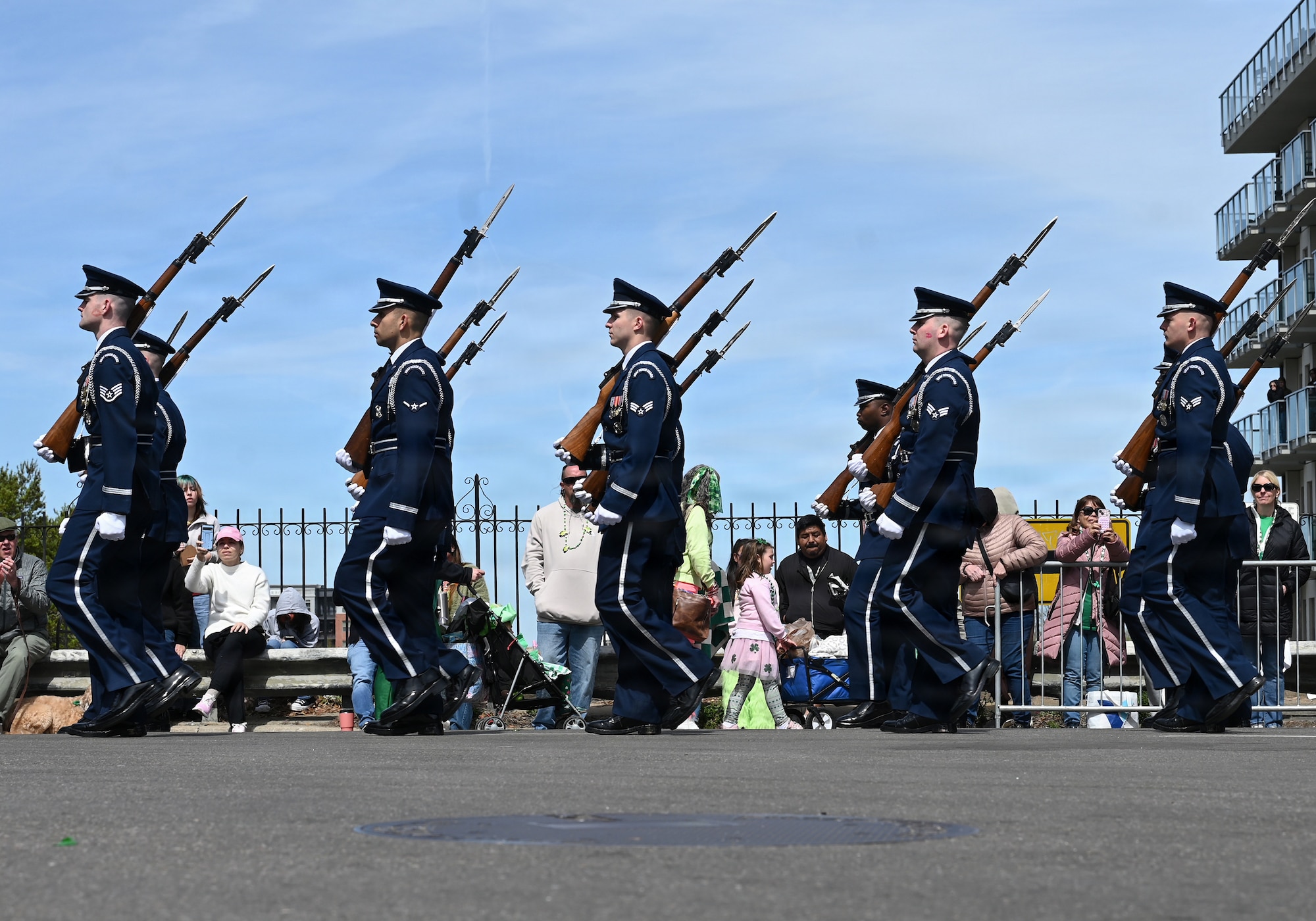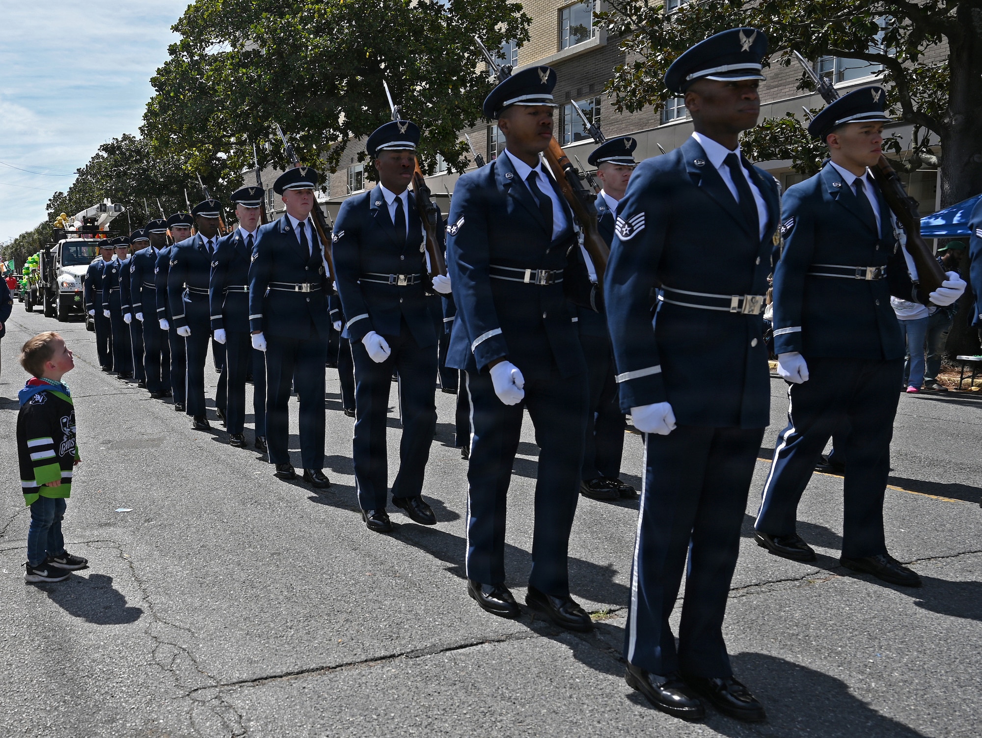 The U.S. Air Force Honor Guard marches during the Savannah St. Patrick’s Day parade in Savannah, Ga., March 17, 2026. Originally created in 1948, the Honor Guard performs more than 100 times a year at national sporting events, international military tattoos, community celebrations and school events, showcasing the Air Force’s readiness and excellence. (U.S. Air Force photo by Tech. Sgt. Sergio A. Gamboa)